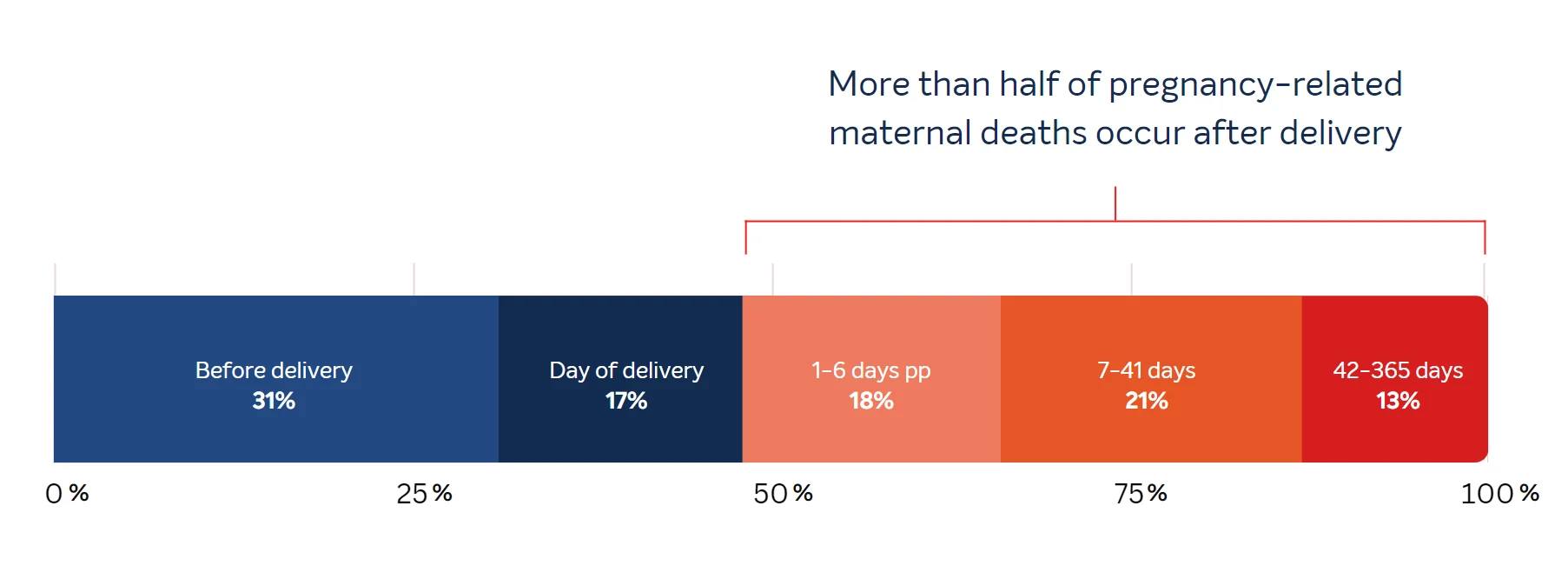 Approximately 2 out of 3 pregnancy-related deaths occur outside of the day of delivery or the week postpartum. More than 80% of pregnancy-related deaths were preventable.