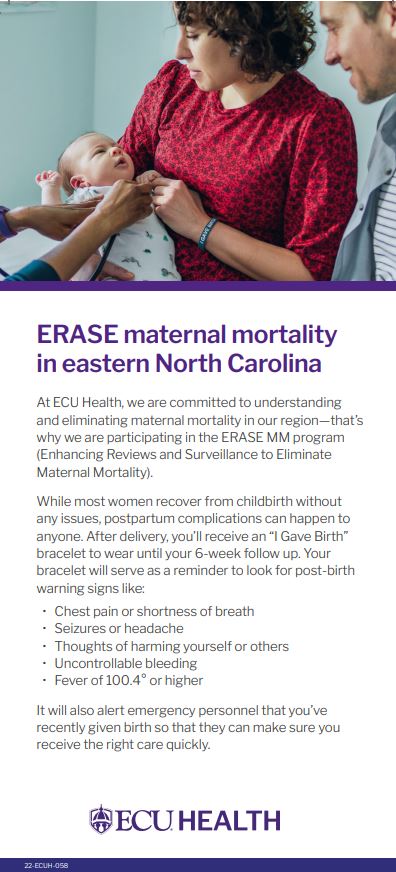 ECU Health Medical Center is the only tertiary care center in Perinatal Region VI; they were influential in allocating best practices and quality improvement initiatives. Below you will see the presentation overview with background, methods, and discussions surrounding the ‘I Gave birth’ initiative. Informational flyer and badge ID cards are included below, serving as a visual reminder of the initiative and care in the 4th trimester.